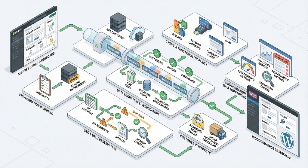 E-commerce Platform Migration Checklist to Avoid SEO & Operational DisastersMigrating from Shopify to WooCommerce offers flexibility, control, and long-term cost advantages  but only when executed with structured planning, precise data handling, and flawless SEO continuity. The framework below provides a comprehensive migration audit covering pre-migration planning, data integrity, URL/SEO preservation, … Read More “Shopify to WooCommerce Migration: Complete Guide”